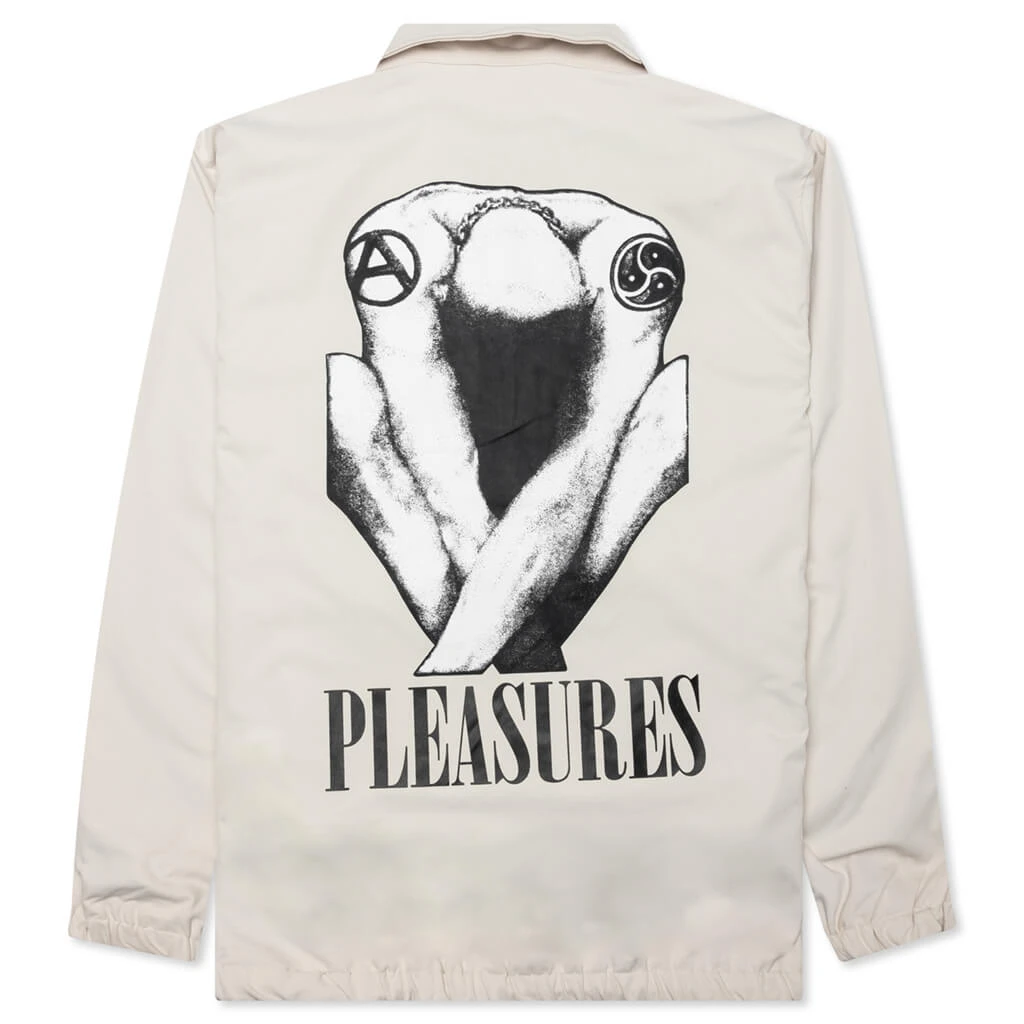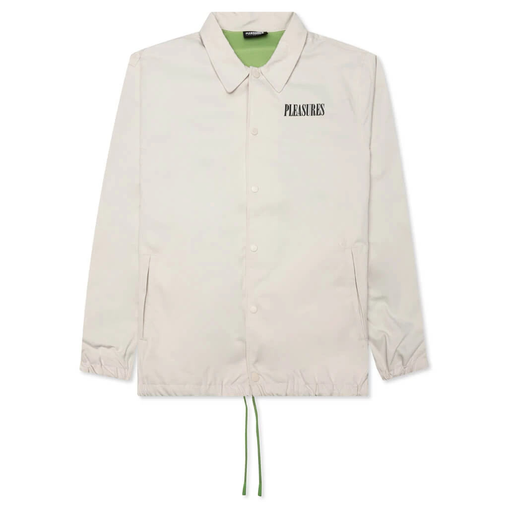 The PLEASURES Bended Coach Jacket takes on a premium aesthetic. The design features a polyester construction as well as a mesh lining. The jacket features double welt side pockets in addition to screen-printed branding at the chest and graphics at the rear. The button-down closure and pointed collar finish the look.