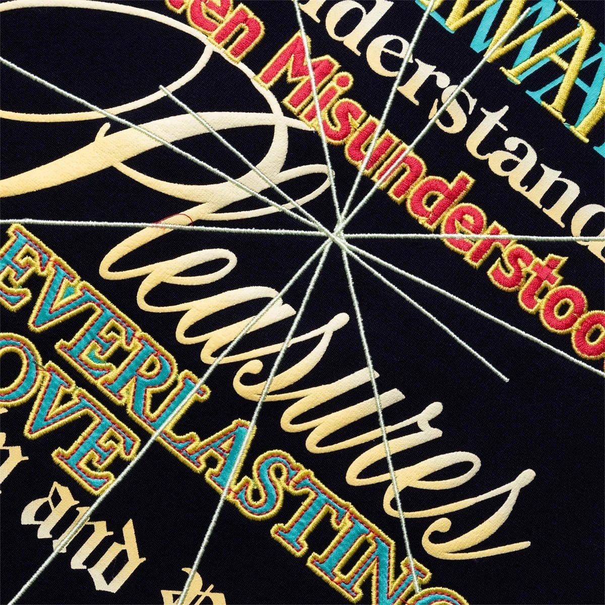 From the mind of designer Alex James, Pleasures is a contemporary expression of the eternally influential and relevant 80s and 90s subculture aesthetic. James has lived and loved the sources of Pleasures’ inspirations, which sets Pleasures apart from the reference mining pack.