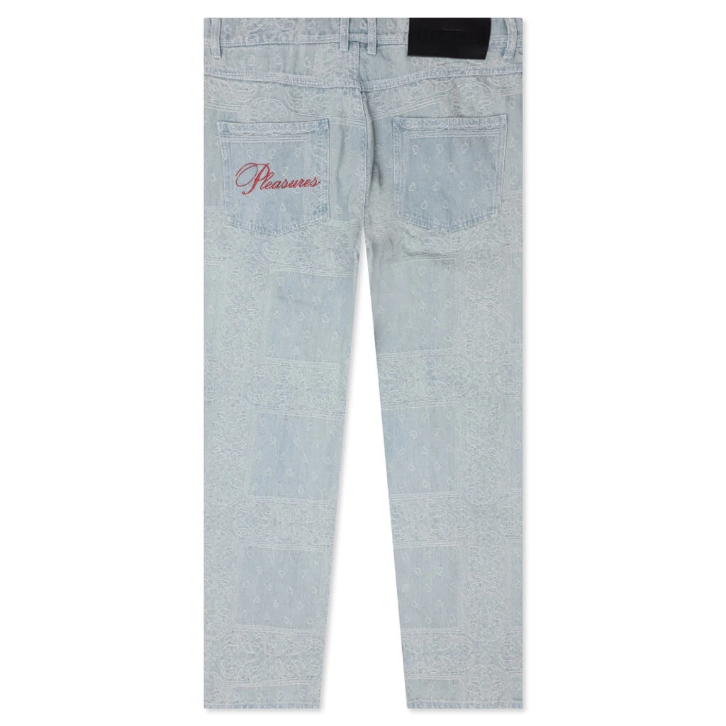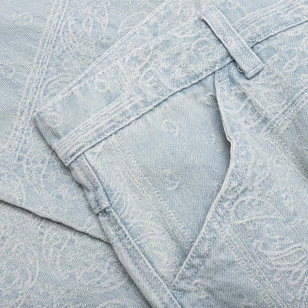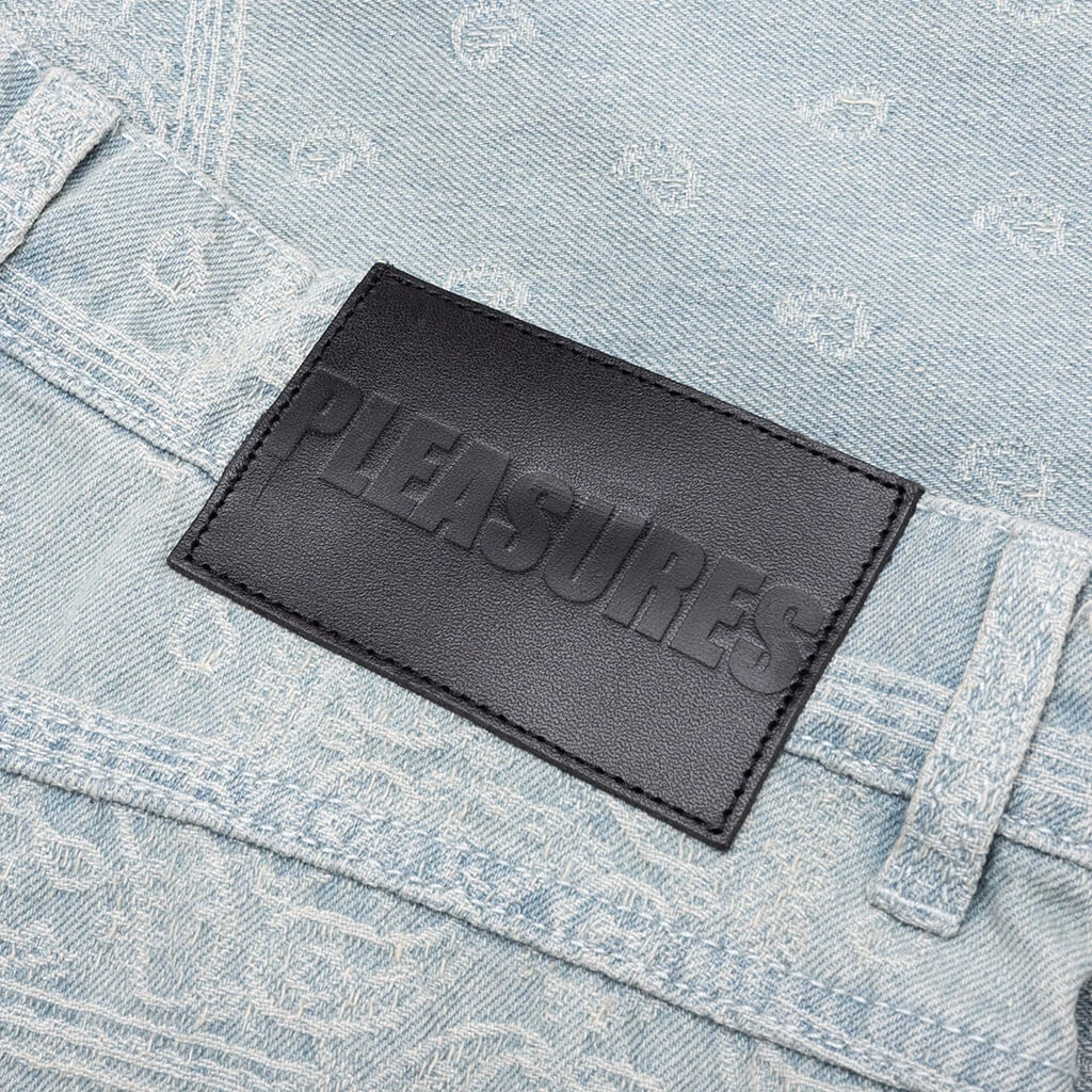 The Pleasures Merit Denim Work Pant makes an impression with its complete cotton construction. The pants feature an embroidered Pleasures logo and a custom jacquard woven paisley pattern placed throughout. The zip fly, belt loops, and pockets wrap up the remainder of the silhouette.