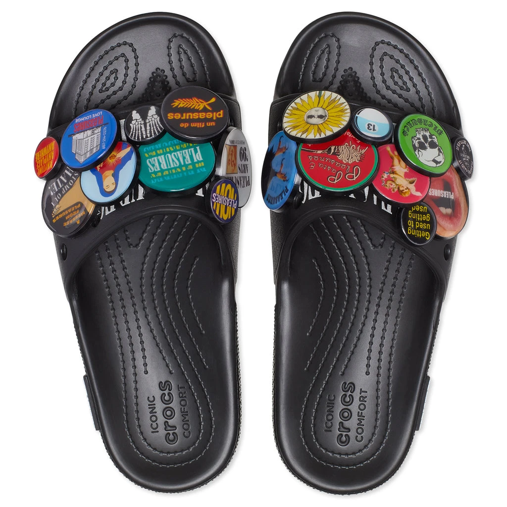 PLEASURES and Crocs introduce the fourth season of their iconic collaboration with the latest rendition of the Classic Slide. PLEASURES present their grunge aesthetic on this blacked-out silhouette, while a bouquet of custom PLEASURES Jibbitz comprises the single-strap design. A PLEASURES logo is placed along the side of the Croslite foam midsole. The silhouette is perfect for any activity and with any outfit.